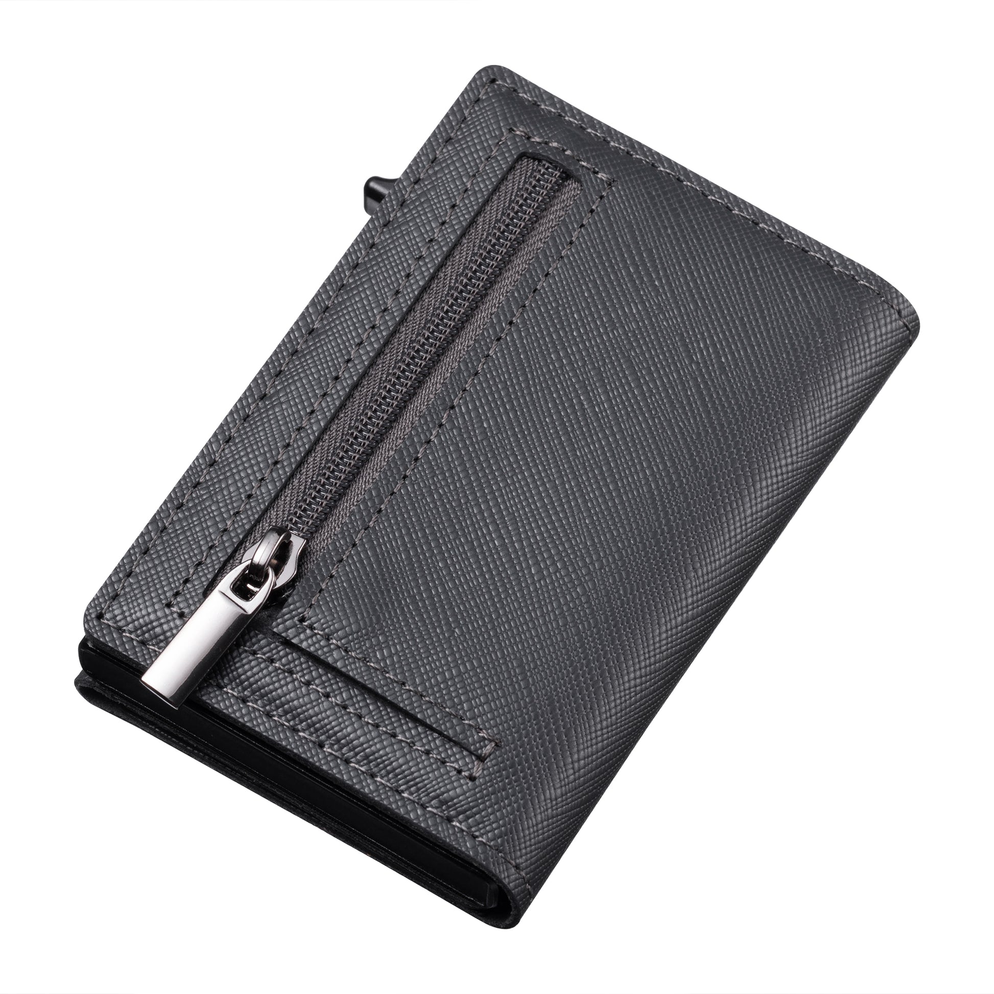 Realizzato in vera pelle. Finitura in saffiano anti graffio. Porta monete con chiusura zip, chiusura magnetica e una tasca interna.