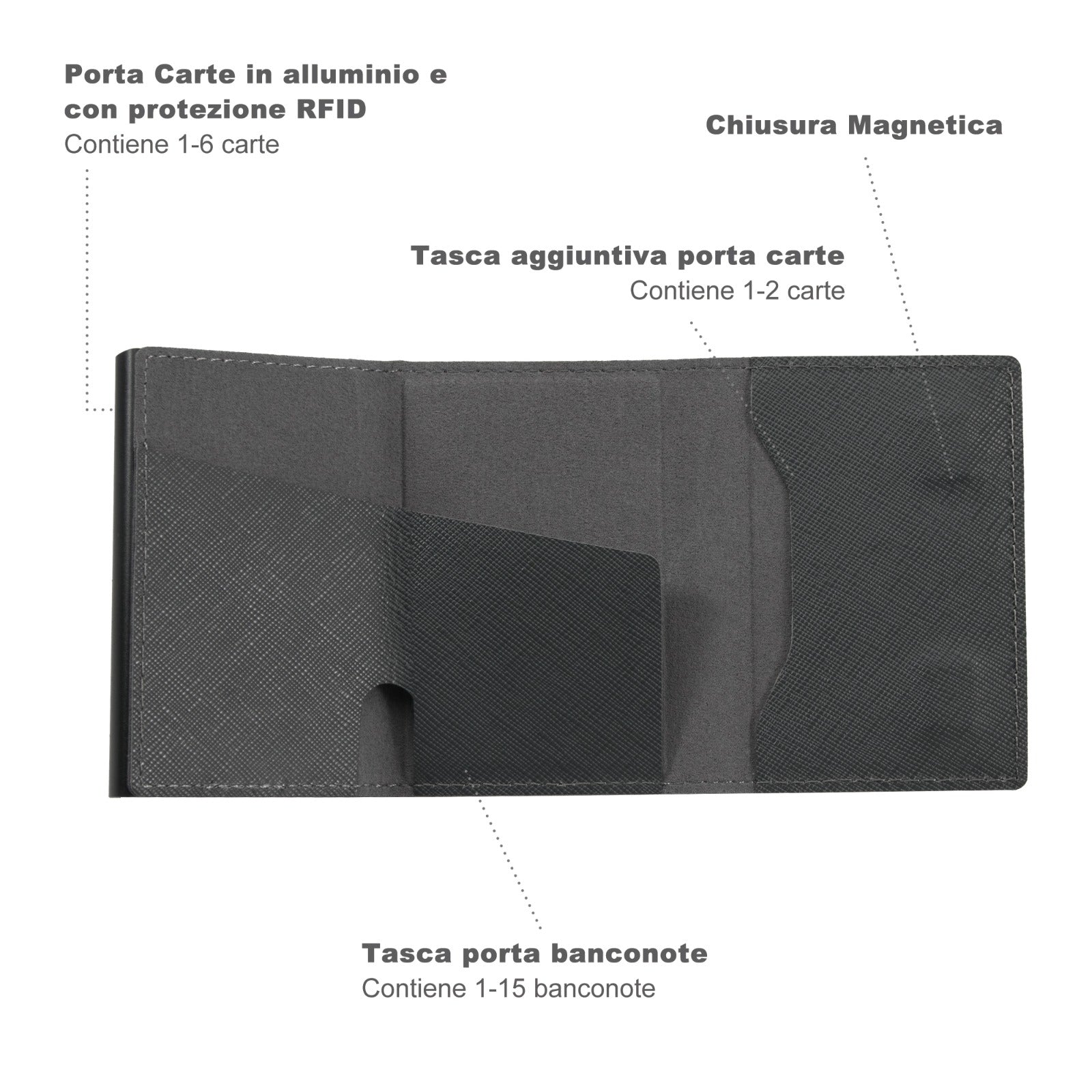 Con 1 tasca interna e la cassa in alluminio porta carte (con protezione RFID) potrai portare le banconote e le carte sempre con te!